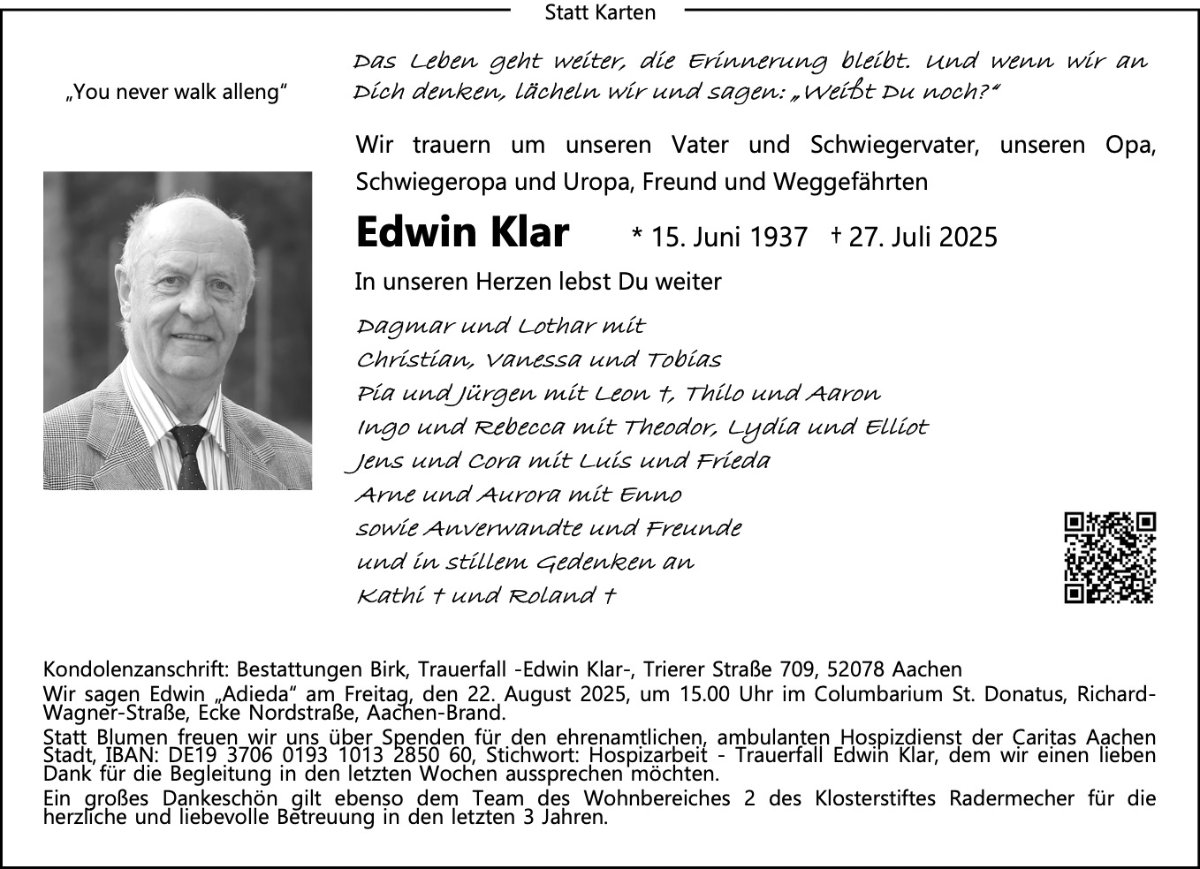 " 88, die Sache macht sich" war sein Lieblingssatz in den letzten Wochen seit seinem Geburtstag im Juni. Bis zum letzten Tag frohgemuht und dankbar zu allen, so wie er konnte. Er ist sanft eingeschlafen. Das tröstet...